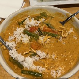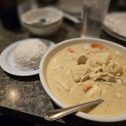 Ordered take out on a Sunday afternoon and it was seamless. From placing the order on the phone to pick up, the service was friendly and efficient. The food itself was flavorful and spicy. Exactly what you want in Thai cuisine. The curries ran exceptionally spicy. The mild curry was as spicy as our hot pad see ew if not hotter. It was still delicious though and can't recommend enough. If you scour the Yelp photos for pictures of the menu, they do a great job of listing gluten free options. The space itself was open, but didn't give vibes for an elevated dine in experience. They charge a 3.5% fee on cards so think about bringing cash. They are at least transparent about it unlike other establishments that do the same. Looking forward to my next Thai takeout from here as it was absolutely delicious!
